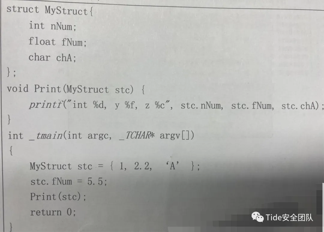 上面的MyStruct就是我们定义的一个结构体。然后在main函数中对结构体中的各个变量赋值,最后打印出来。
