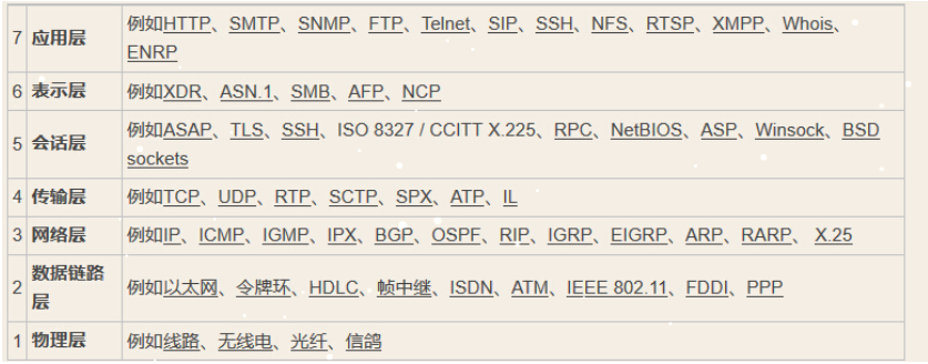 七层网络模型首先从网络通信的分层模型讲起:七层模型,亦称OSI(Open System Interconnection)模型。自下往上分为:物理层、数据链路层、网络层、传输层、会话层、表示层和应用层。所有有关通信的都离不开它,下面这张图片介绍了各层所对应的一些协议和硬件