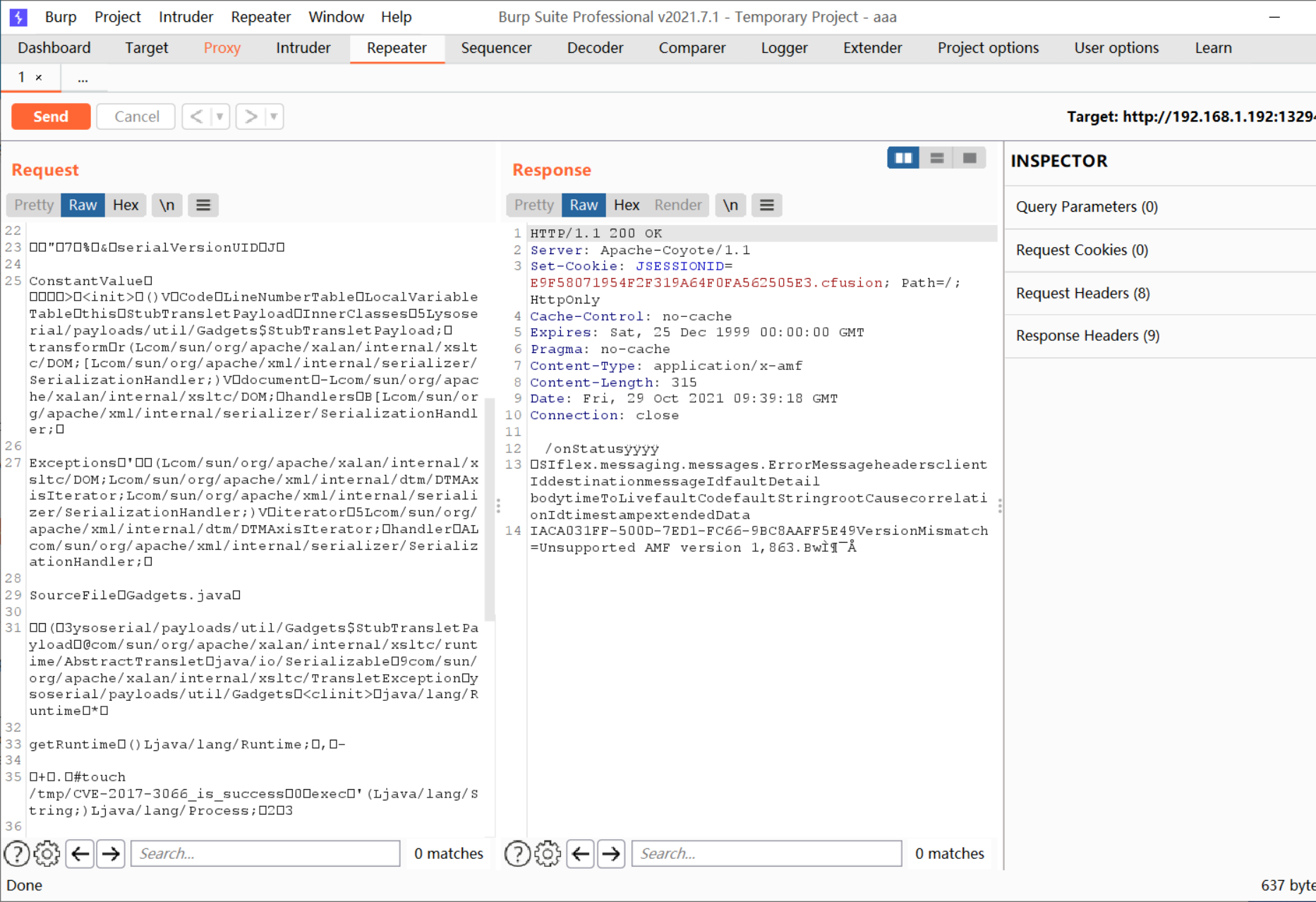 ,将 POC 作为数据包 body 发送给 http://ip:port/flex2gateway/amf,Content-Type 为 application/x-amf: