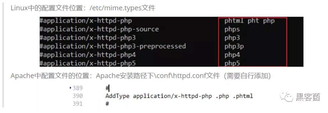 替换.php后缀为其它后缀进行绕过:需要进行配置(Linux配置中默认是打开的;而Apache配置中是需要自行添加的),一般替换为.phtml