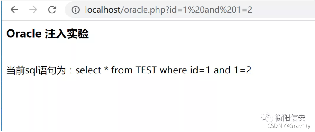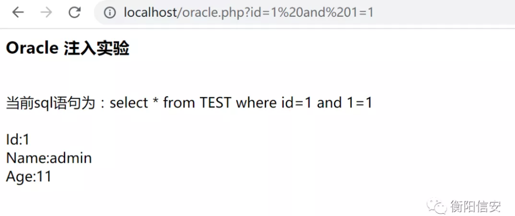 2、访问http://localhost/oracle.php?id=1,返回如下界面表示搭建成功,数据库也成功连接了。