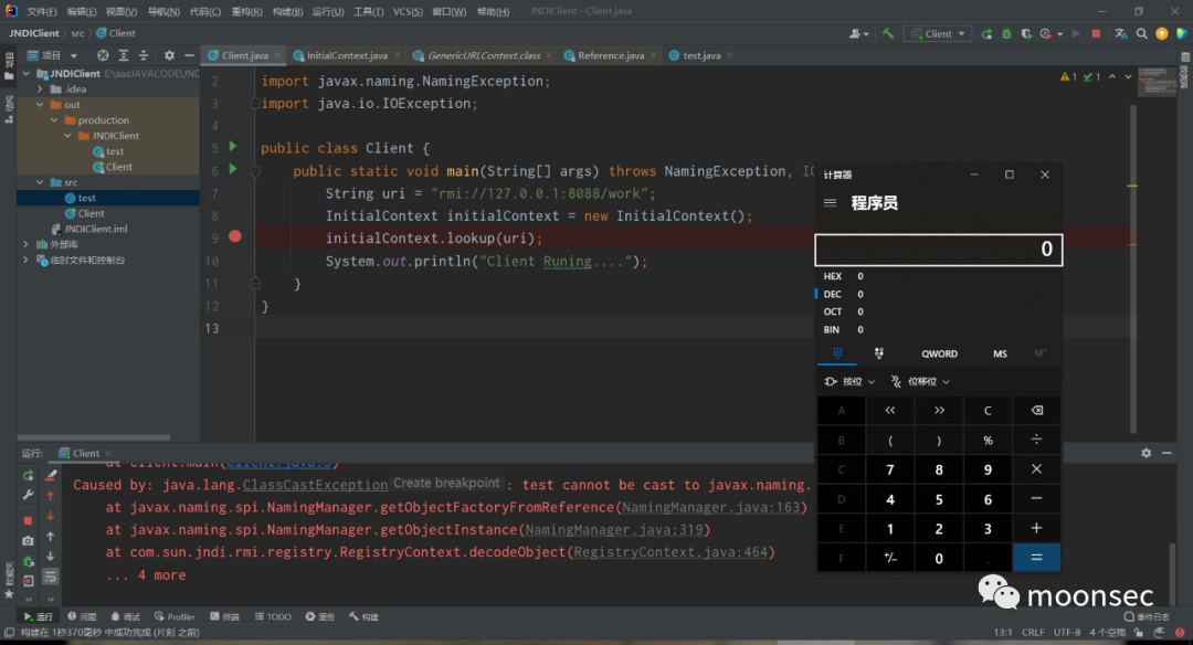复制代码 其实这就是一个典型的JNDI注入,如果客户端的uri可控的话,就会加载rmi服务端的恶意类。从这里可以看出,恶意的类,我放到了web服务中。