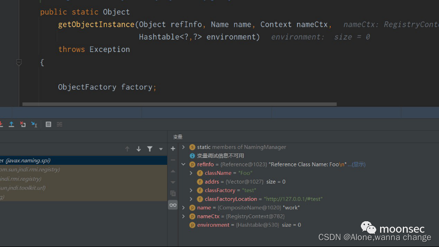 复制代码 接下来我拿出getObjectInstance一部分重要的代码来分析,这里将refInfo存到了一个临时变量ref中,并在12行获取类名之后。14行统一传入进去了