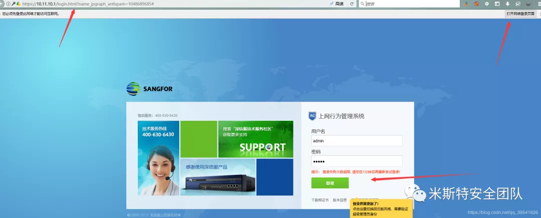 探测到可访问sangfor深信服上网行为管理地址:https://10.11.10.1/login.html?namejpgraphantispam=1048689685#