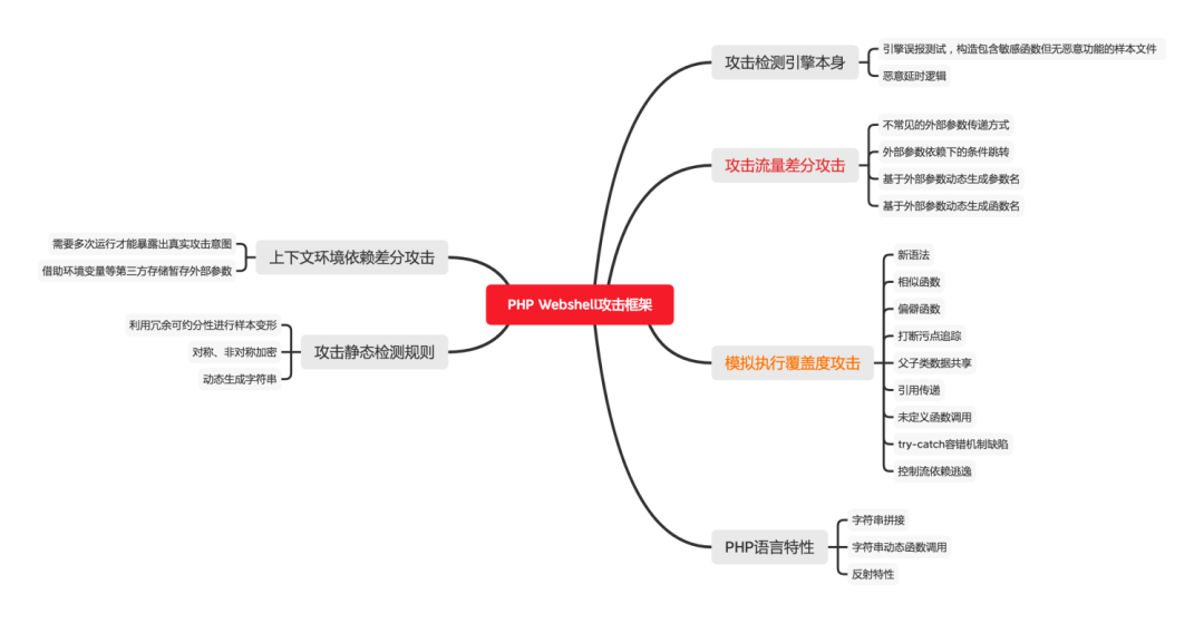 2、模拟执行覆盖度攻击业内目前针对PHP Webshell,主流的做法是采用【静态/动态AST词法分析】或者【动态沙箱检测】技术,对这类防御手段来说,攻防博弈的战场在于【模拟引擎的完成度】,具体来说例如: - php各类版本、生僻语法的支持度