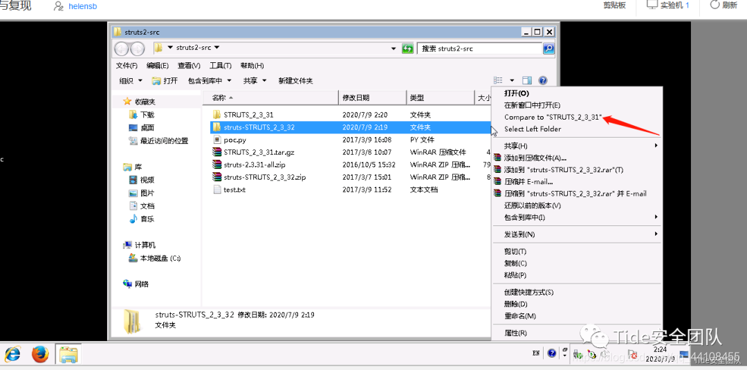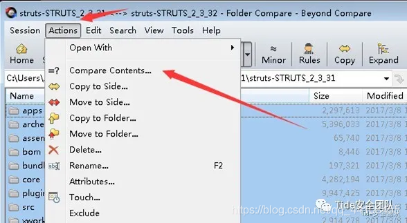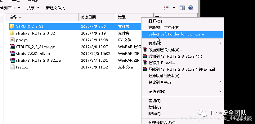 然后右击struts-STRUTS_2_3_32目录,选择Compareto”struts-STRUTS_2_3_31”来与之前的文件夹里所有文件进行对比