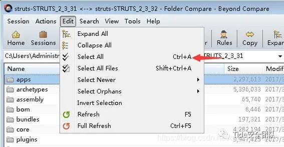 然后在菜单栏点击 edit,选择Select All或者直接按Ctrl+A 选中所有文件进行对比