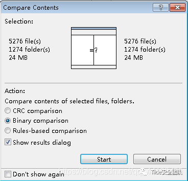 弹出如下对话框,   比较方式选择Binary comparison,把show results dialog 勾选上,然后点击Start等待比较完成。