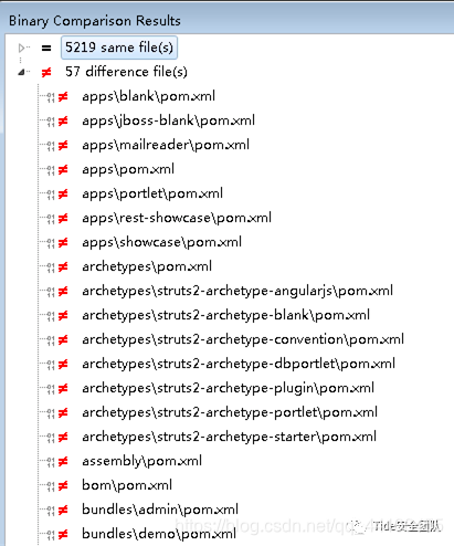 比较完成后如下图所示,下面显示的红色的为有修改的,一共有57个文件内容不同。