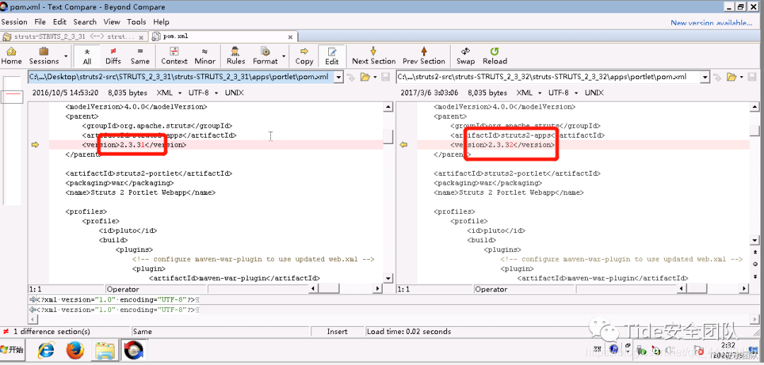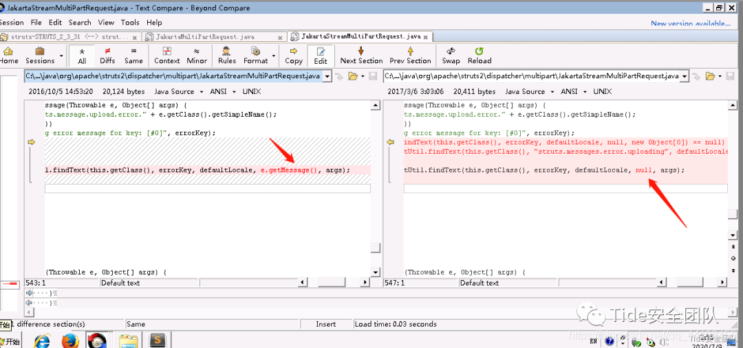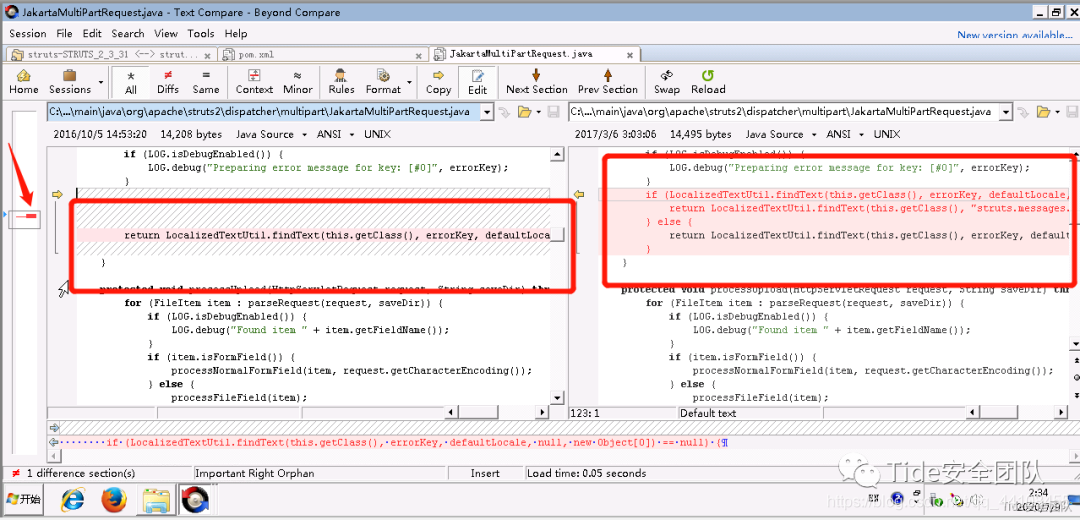 我们下载了2个版本的源码,分别是2.3.31有漏洞的版本,另一个是2.3.32修复后的版本,我们使用工具来比较2个版本的文件,找到补丁修改的代码。