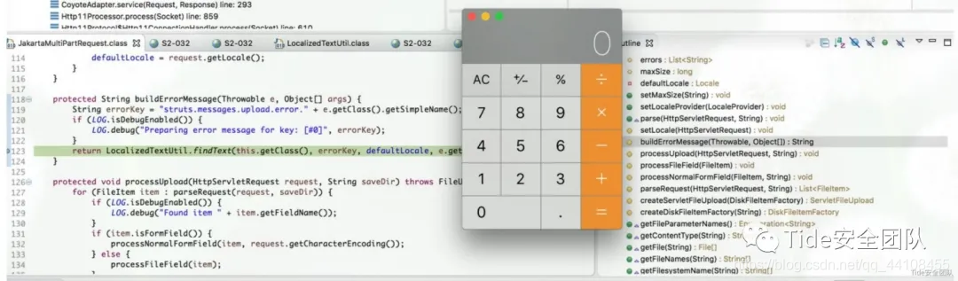 也就是调用了org.apache.struts2.dispatcher.multipart.JakartaMultiPartRequest类的parse方法,可以继续跟进processUpload,最终跟踪到该函数发生了异常,在调用里面可以看到,当处理 multipart 的时候发生了异常,进入了parse的异常分支,然后调用了前面存在漏洞的方法。