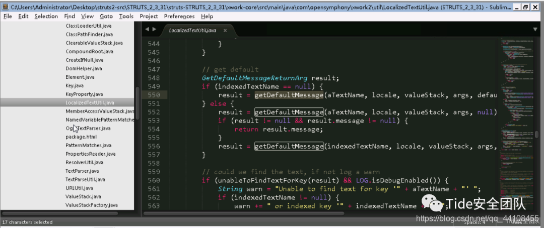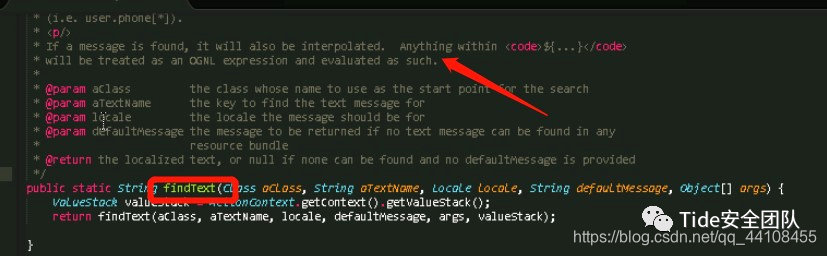 那么咱们就打开有漏洞的那一版本的源代码,跟进LocalizedTextUtil.findText,因为java支持方法重载,所以在找findText的时候可能会有多个findText函数,我们根据这里的传参个数,以及参数的类型,就可以找到这里实际调用的函数,我们可以在xwork-core\src\main\java\com\opensymphony\xwork2\util\LocalizedTextUtil.java里找到这个方法。