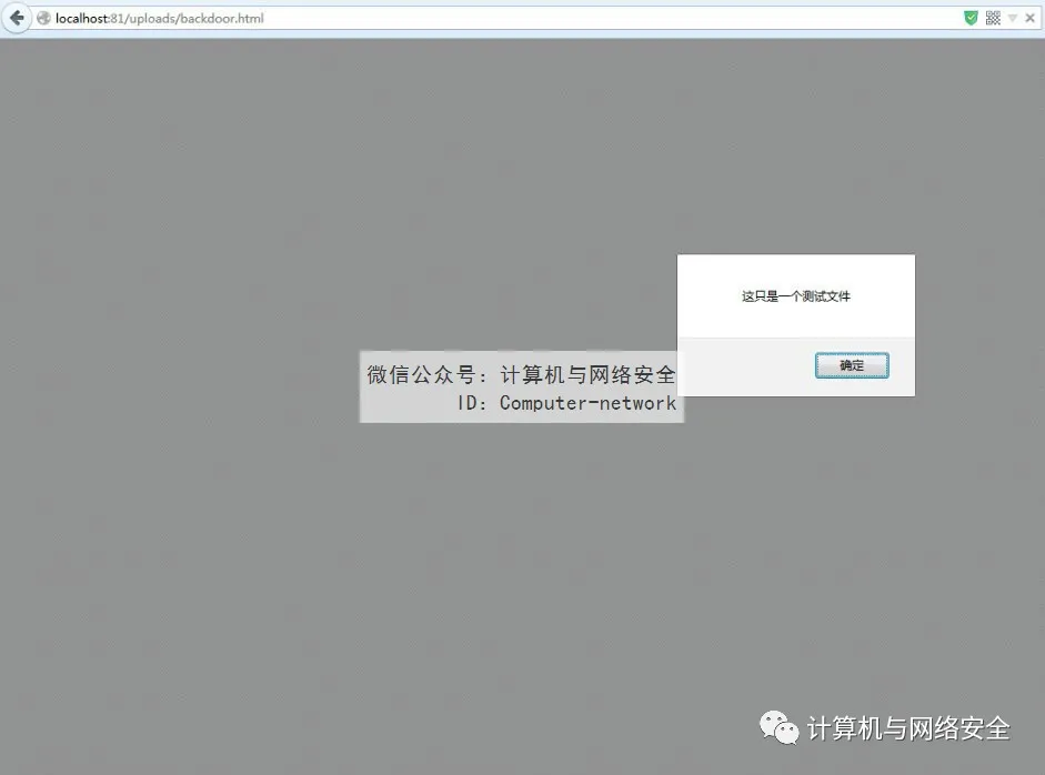 如果这个HTML文件是攻击者上传的后门文件(后门文件本质上是小马文件或者大马文件),那么此时此刻,攻击者就已经绕过了$dis_allowed_Extensions这个黑名单的限制,获取了站点的shell。开启浏览器,输入http://localhost:81/uploads/backdoor.html,Web服务器返回信息如图20所示。