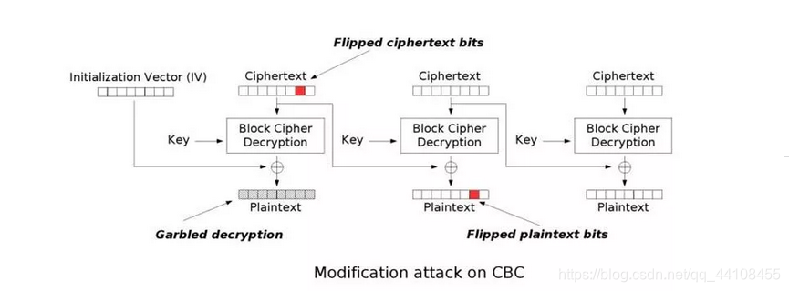 1、在 CBC 解密的公式中可以注意到Ciphertext-(N-1)用来产生下一块明文,这就是字节翻转攻击发挥作用的地方。如果我们改变Ciphertext-N-1中的一个字节,然后和下一块解密后的密文xor,就可以得到一个不同的明文,而这个明文是我们可以控制的。