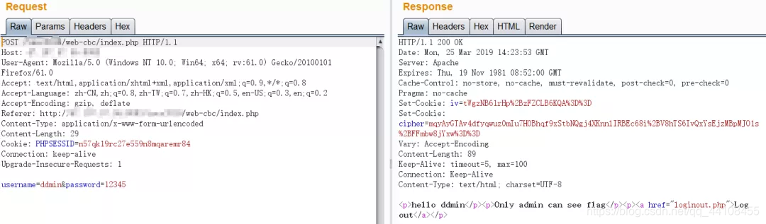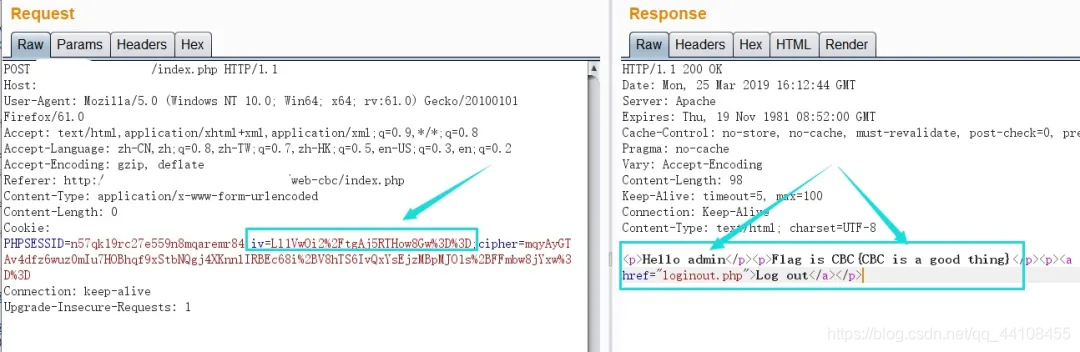 由于刚开始用户的输入不能是admin所以提交用户名为"ddmin",但是只有是admin用户才能查看Flag,所以只能利用代码上的提示:define("METHOD", "aes-128-cbc"); 利用 CBC 字节反转攻击构造admin。