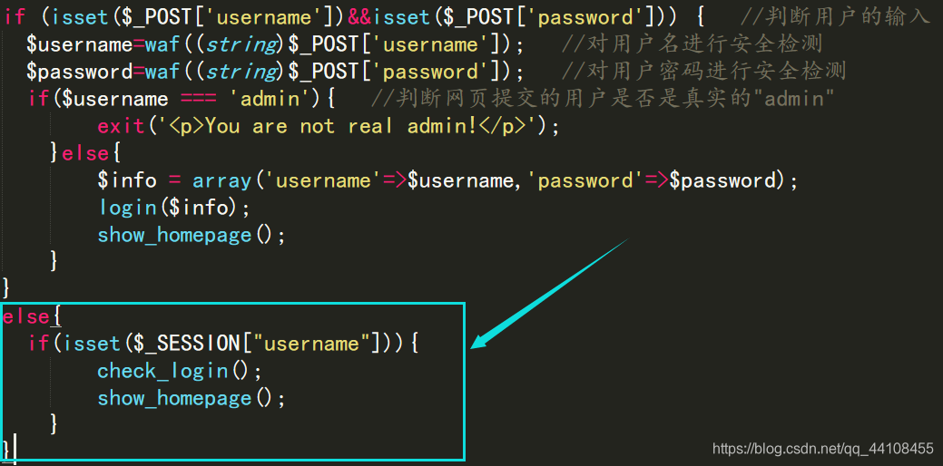 - echo '<p>hello '.$_SESSION['username'].'</p>'; //如果不是admin用户,网页则会显示"hello <username>"