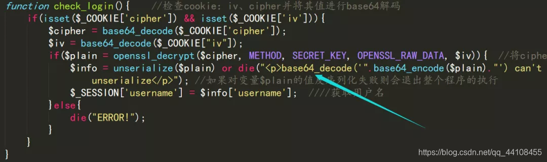 - $info = unserialize($plain) or die("<p>base64_decode('".base64_encode($plain)."') can't unserialize</p>"); //如果对变量$plain的值反序列化失败则会退出整个程序的执行