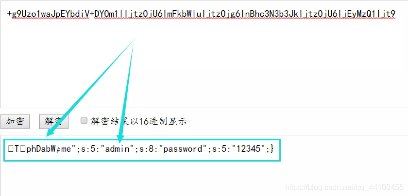- cipher = base64.b64decode('+g9Uzo1waJpEYbdiV+DYOm1lIjtzOjU6ImFkbWluIjtzOjg6InBhc3N3b3JkIjtzOjU6IjEyMzQ1Ijt9') //这里放burp放回的base64数据