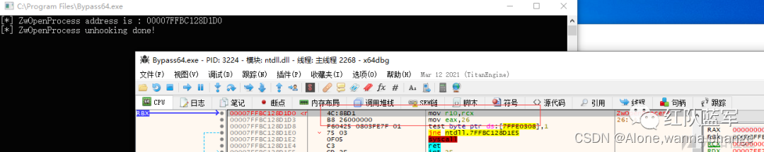 当我单步执行到unhook done后,看到NtWriteVirtualMemory确实已经复原,unhook成功了!