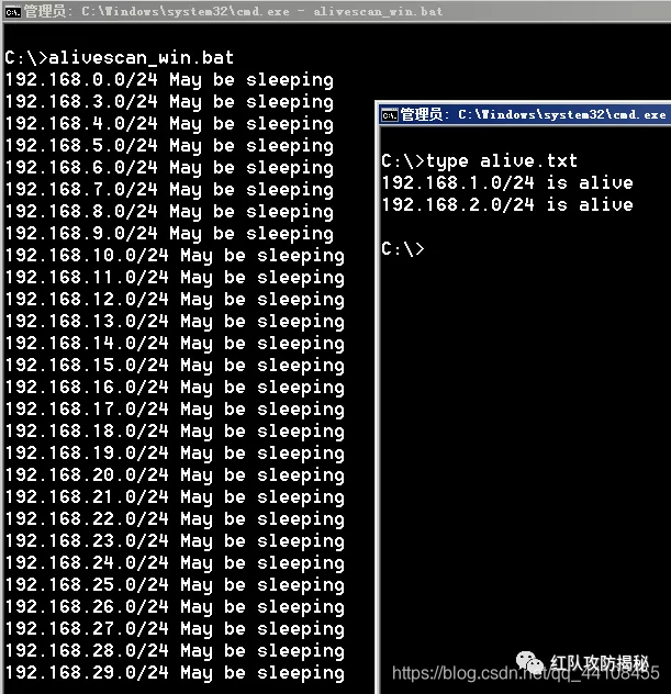 - if !errorlevel! equ 0 (echo 192.168.%%t.0/24 is alive ! >> alive.txt ) else (echo 192.168.%%t.0/24 May be sleeping ! )