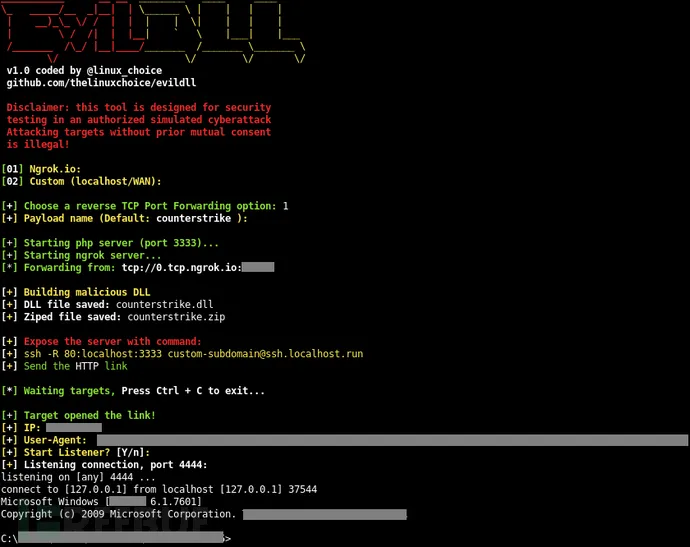 满足上述工具运行条件之后,就可以使用下列命令运行EvilDLL了: