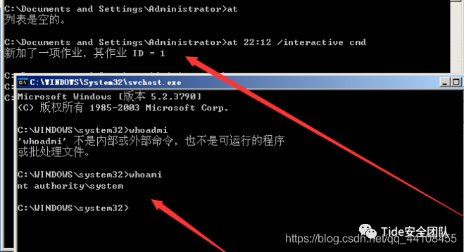 2.4 无凭证条件下的权限提升0x03 按系统类型类型3.1 Windows2000/2003、XP3.1.1 at本地命令提权在 Windows2000、Windows 2003、Windows XP 这三类系统中,我们可以轻松将 Administrators 组下的用户权限提升到 SYSTEM at 是一个发布定时任务计划的命令行工具,语法比较简单。通过 at 命令发布的定时任务计划, Windows 默认以 SYSTEM 权限运行。定时任务计划可以是批处理、可以是一个二进制文件。 - 语法:at 时间 命令
