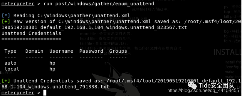 复制代码 除了Unattend.xml文件外,还要留意系统中的sysprep.xml和sysprep.inf文件,这些文件中都会包含部署操作 系统时使用的凭据信息,这些信息可以帮助我们提权。