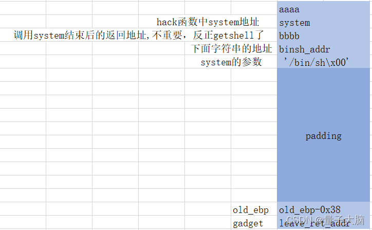 另外,由于leave指令会pop ebp,将esp地址拉高4个字节,所以需要aaaa打头来平衡,pop掉aaaa后,esp将会指向system的地址,再pop给eip的就是system的地址了。