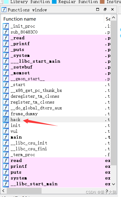 发现了函数列表中有个hack函数,进去发现了system函数。但是没有/bin/sh,需要自己填入。