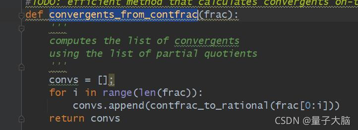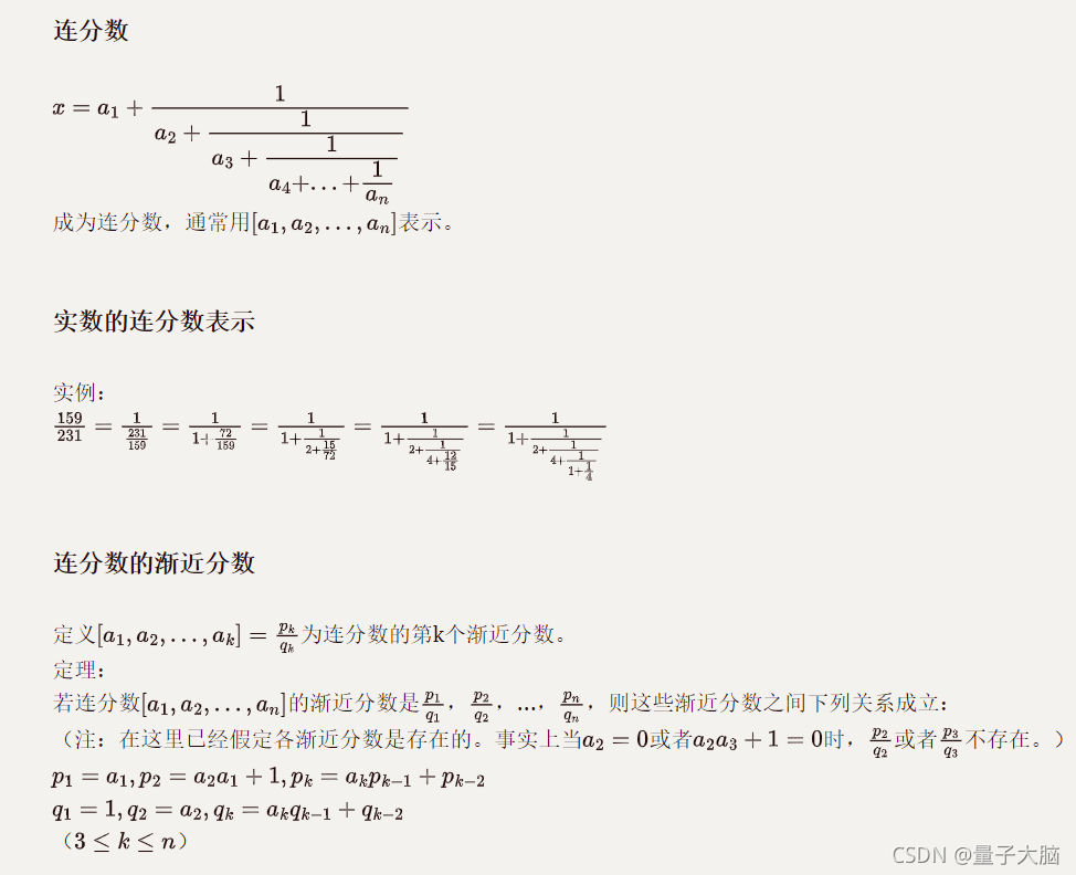 这样,convs数组就是保存连分数的渐近分数的数组,遍历frac逐渐求出渐进分数。