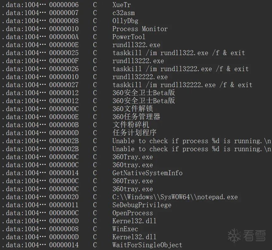 想要找到密码,首先要找到密码在哪。我们不妨来分析一下:首先密码大概率是硬编码在代码中的,因为本地的exe程序是先要解出恶意代码本体,然后执行恶意代码才能连接上远程服务器。至于为什么不是反着来的,大家可以自己思考一些。